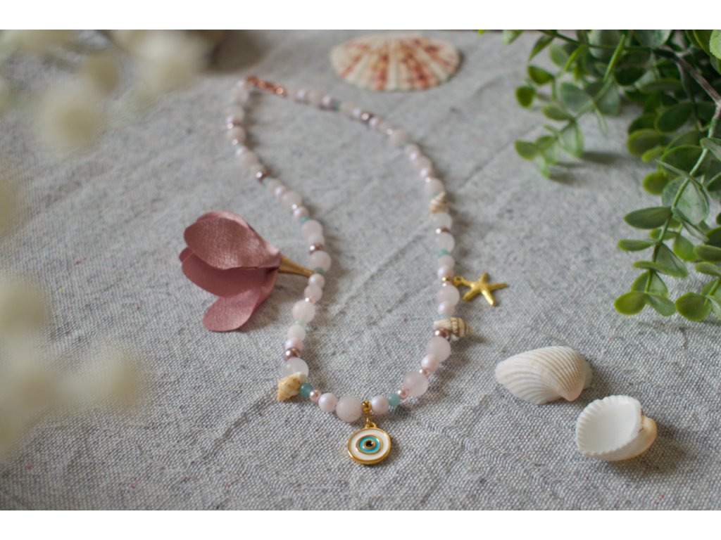 Romantický náhrdelník v něžných růžových tónech kombinuje uklidňující růženín s harmonizujícím amazonitem. Zdobený zlatou mořskou hvězdou a vzdušným květinovým přívěskem ve starorůžové barvě připomíná kouzelné podvečery na plážích Santorini. Doplněné o pravé mořské mušle, které dotváří plážový styl.