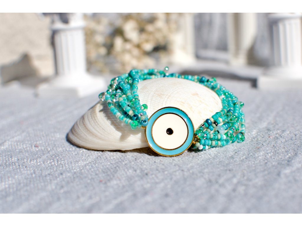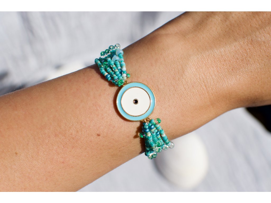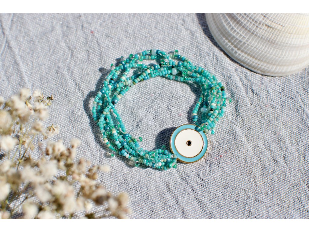 Tento šperk tvoří pět jednotlivých náramků, navlečených na elastické gumičce, které dohromady vytvářejí hravý, ale zároveň elegantní celek. Kombinace tyrkysových a zelených tónů připomíná barvy řeckých mořských zátok, přívěsek ve tvaru řeckého oka pak nese symboliku ochrany a štěstí.