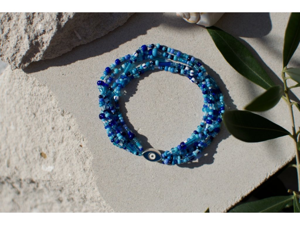 Tento náramek je ručně vyrobený z kvalitních českých korálků značky Preciosa, které hrají odstíny modré – od jemně blankytné až po hlubokou mořskou.