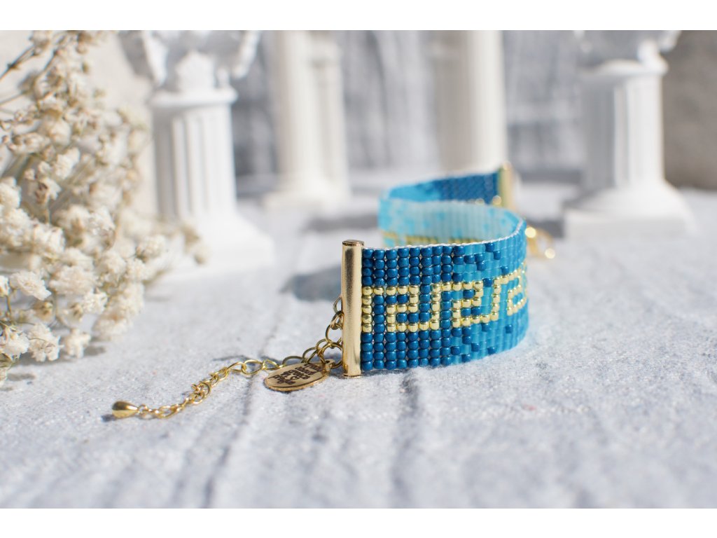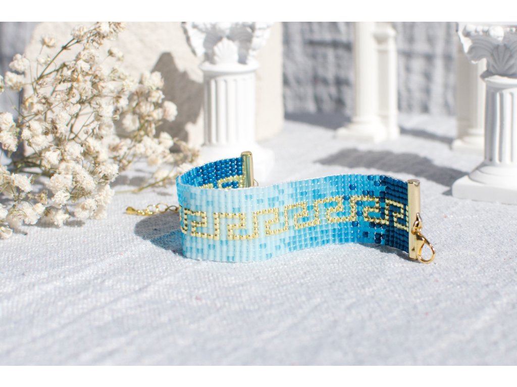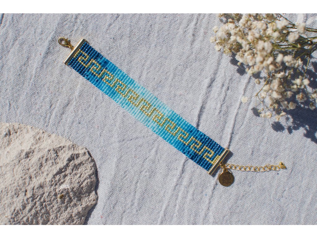 Ručně šitý náramek z TOHO korálků s klasickým řeckým motivem meandru na modrém pozadí, kde jednotlivé odstíny modré přecházejí jedna v druhou, tak jako odlesky na hladině moře.