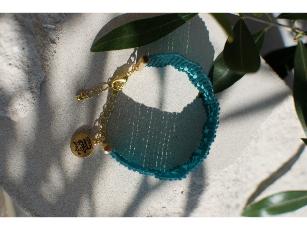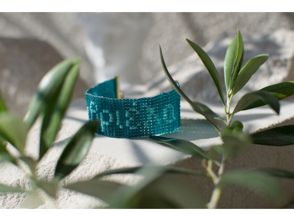 Široký tkaný náramek z japonských korálků TOHO v tyrkysových tónech s motivem mořské vlnky. Ruční práce inspirovaná Řeckem.