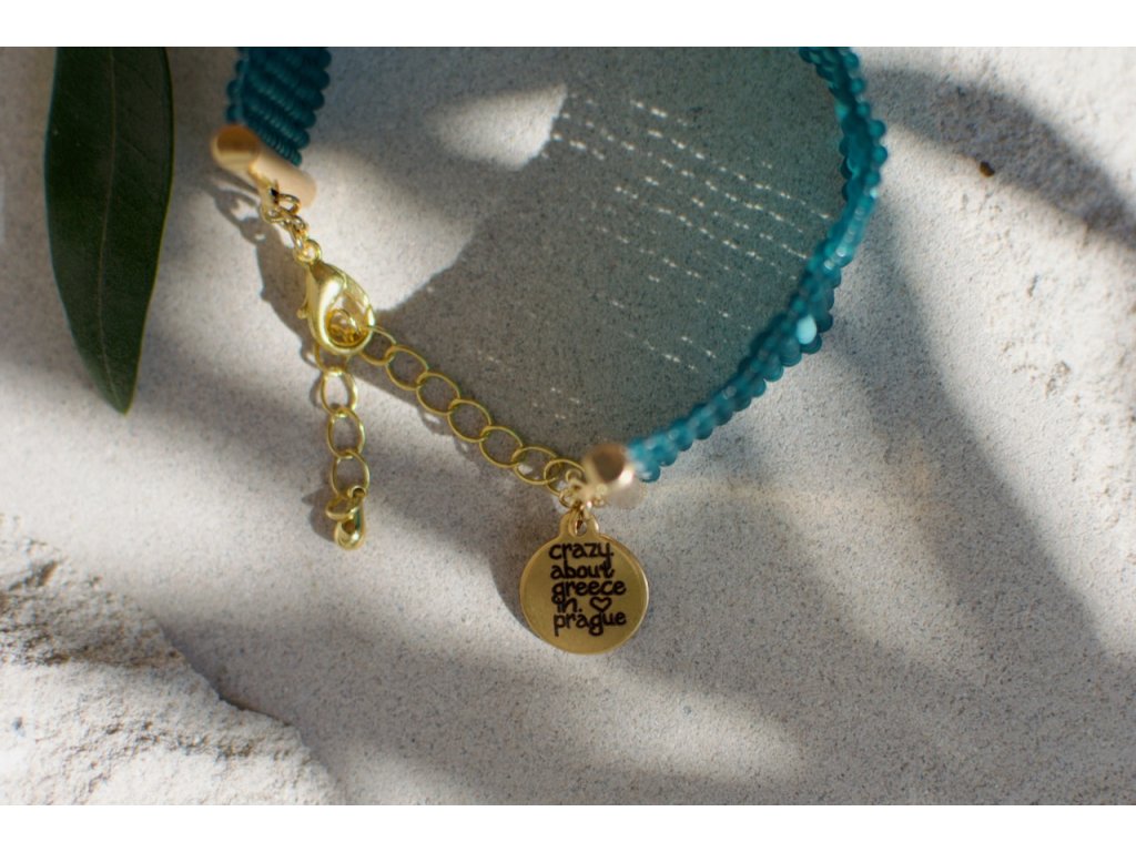 Náramek z drobných českých korálků Preciosa v tyrkysovo-zelených tónech. Spojené přívěskem ve tvaru řeckého oka, navlečené na elastické gumičce.