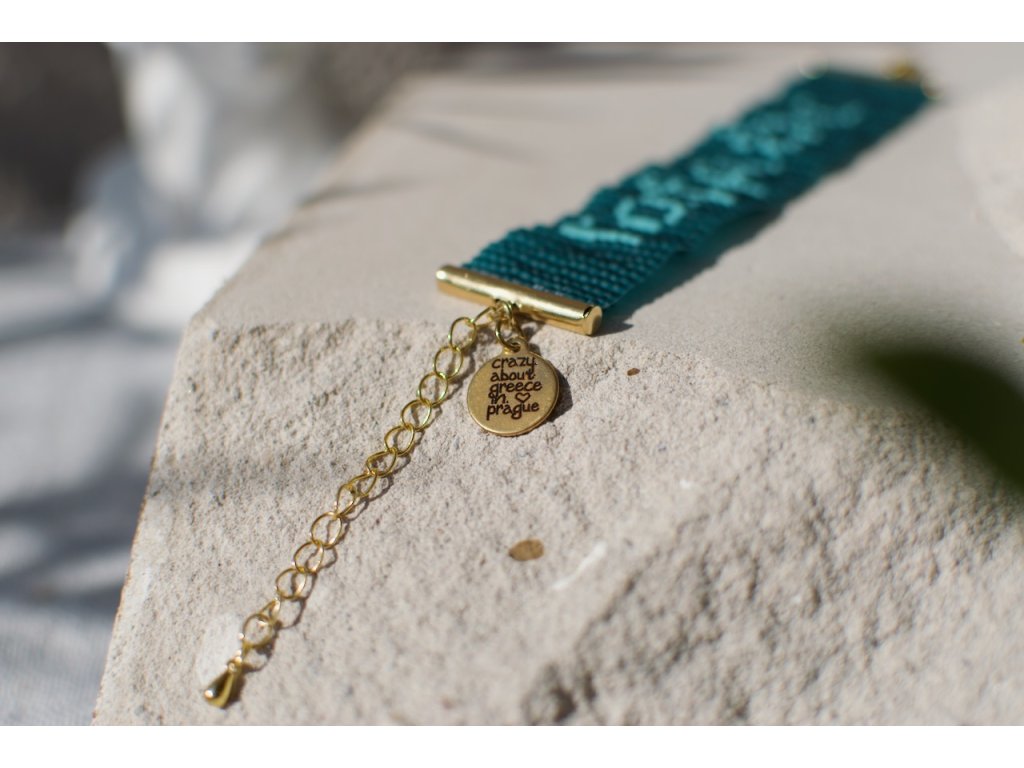 Náramek Řecké slunce je z minerálního nefritu a zlatých kovových korálků. Zdobí ho přívěsek s řeckým okem a autorský detail s logem značky. Jemná síla a středomořské světlo na tvém zápěstí.