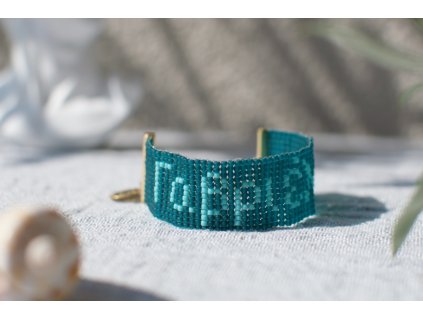 Originální široký náramek (2,5 cm) tkaný z prémiových japonských korálků TOHO, laděný do harmonických odstínů tyrkysové, připomínajících barvy Egejského moře. Uprostřed se v jemném vzoru vlnky odráží atmosféra léta, pláže a klidného šumění mořských vln.