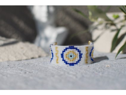 Široký tkaný náramek z japonských korálků TOHO s motivem řeckého oka a zlatými detaily. Elegantní ochranný symbol v moderním provedení.